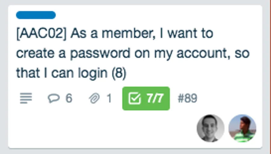 As you can see, this user story describes one thing which a user, in this case, a member, wants to do with the service – namely, create a password for their online account. (This example is a screenshot from our project’s Trello board – find out more about the tools we use in this blog post.)